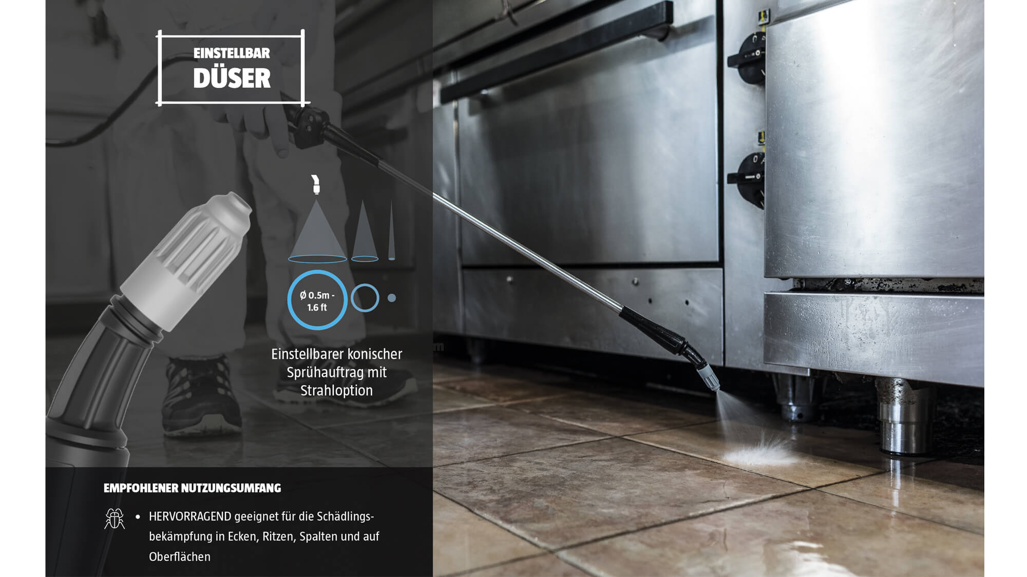 - Elektronische Zweistufenregelung für einen homogenen Sprühauftrag (PI Schädlingsbekämpfung / PII Desinfektion)