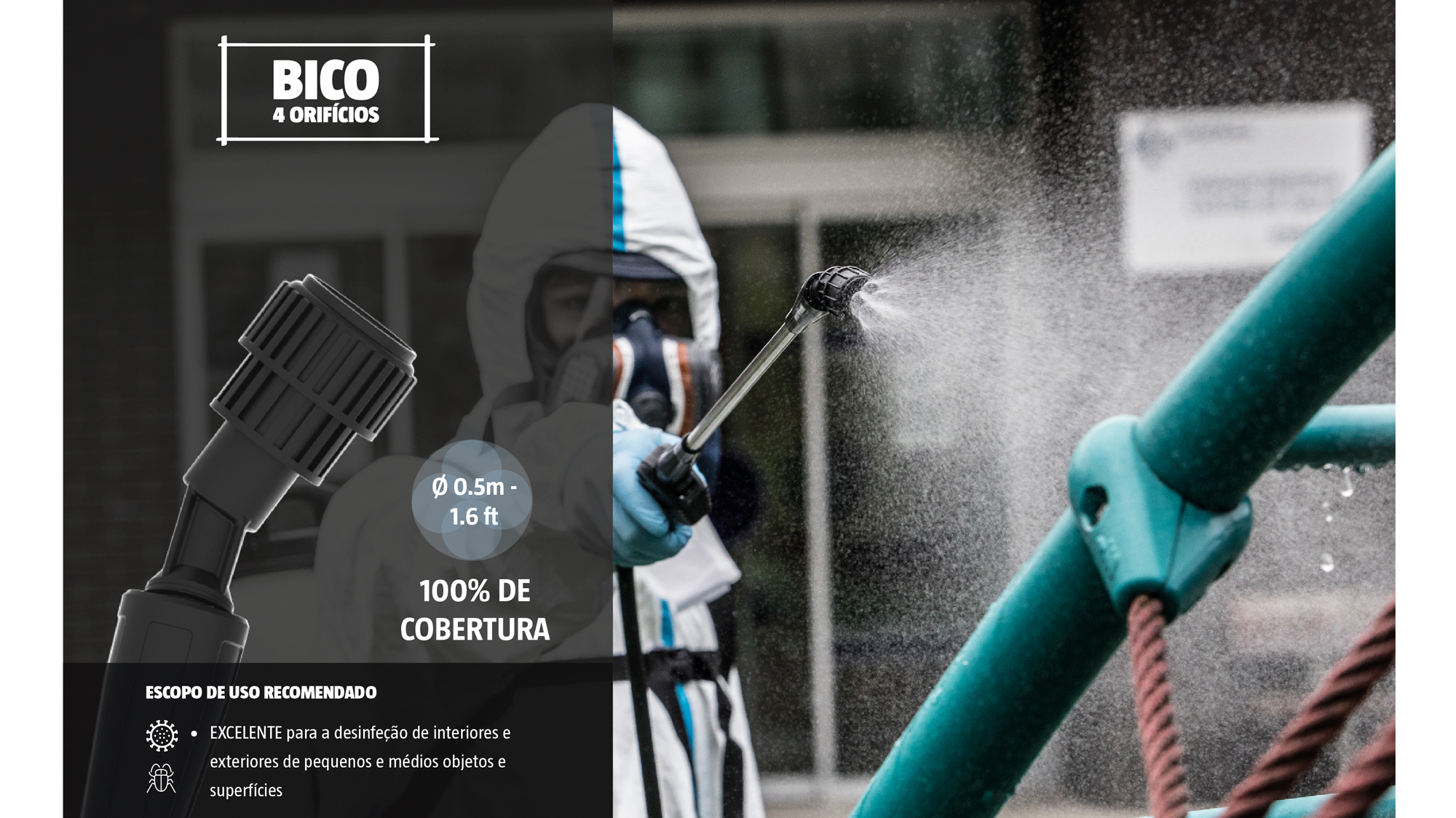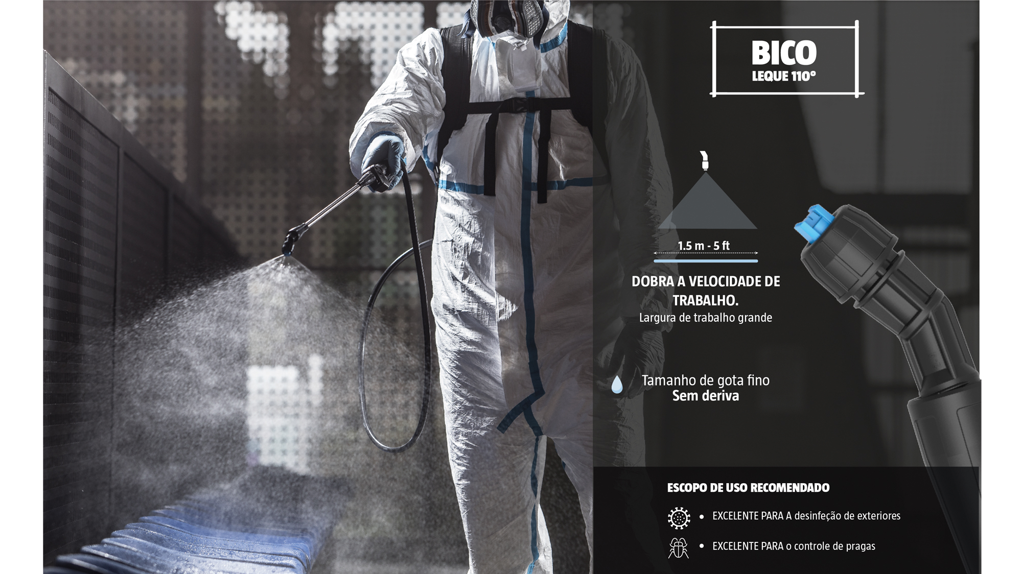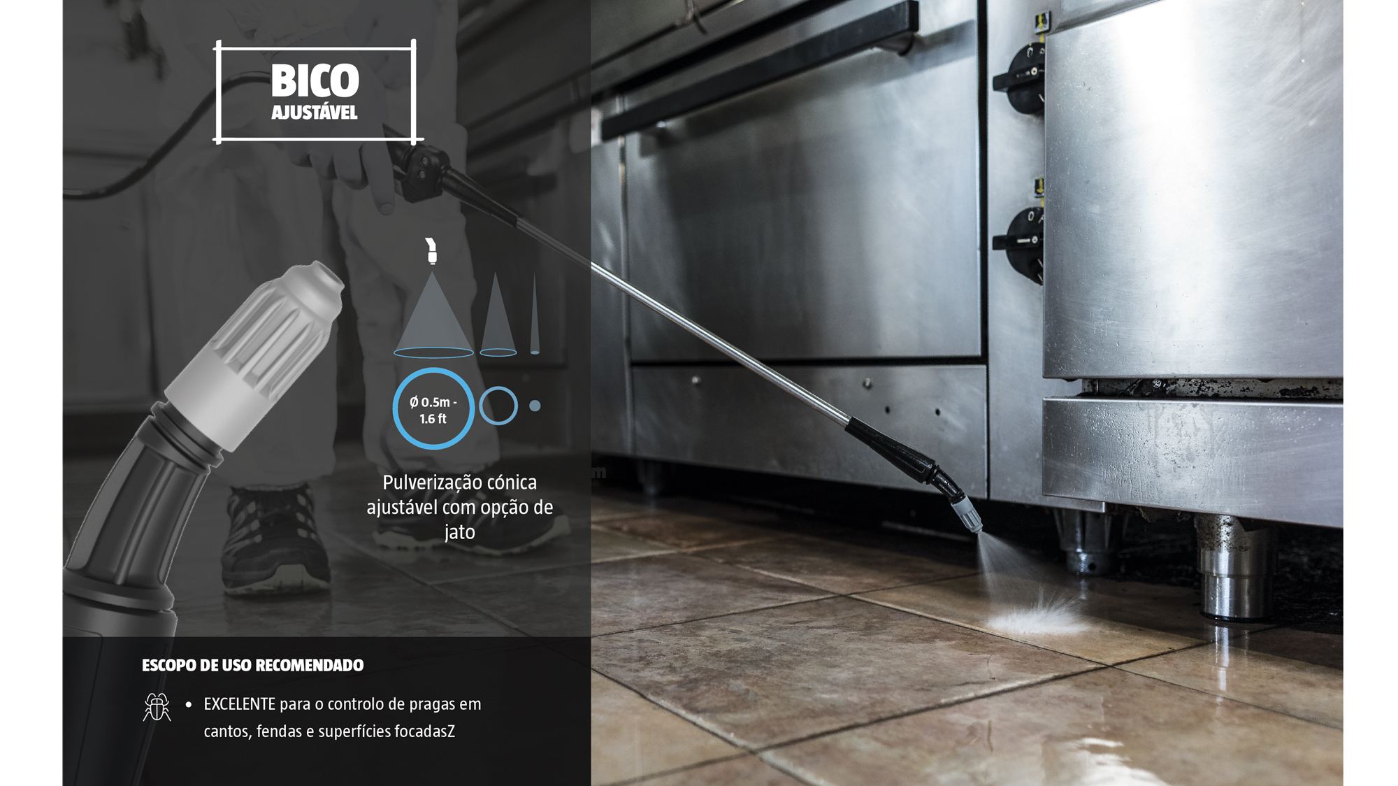 - Controle eletrônico de duas posições para uma pulverização homogênea (PI Controle de Pragas / PII Desinfecção)